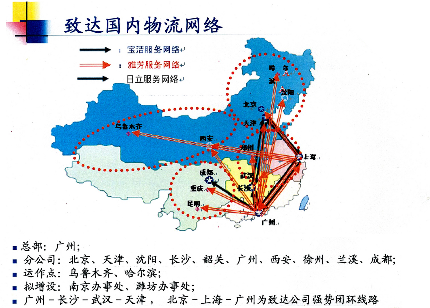在全国各大中城市提供仓储、分拣、包装、发货、提货、派送、签单返回、到付款、异地调货、第三方物流供应、物流供应链解决方案等系列服务(致达物流现有直属车辆、合同车辆共计128台,并在广东地区设有2万平方米储仓,以广东为运营中心,分设上海、广西、福建、湖南、湖北、安徽、山东、天津、江苏、辽宁、陕西、四川运营网点)。